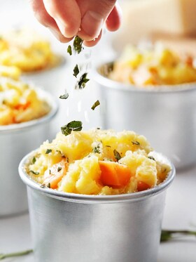 4. Häll potatisblandningen i formarna och strö på parmesanost, salt och svartpeppar.