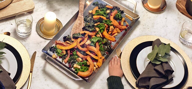 Pumpa är en ingrediens som borde användas mer - dess vackra jordnära och nötaktiga smak är förstärkt med en sötma när den tillagas i en Teppanyaki-panna. För att balansera sötman kan man lägga till grönkål och granatäppelkärnor. En läcker och mättande vegetarisk måltid som smakar extra bra när det är kallt ute.