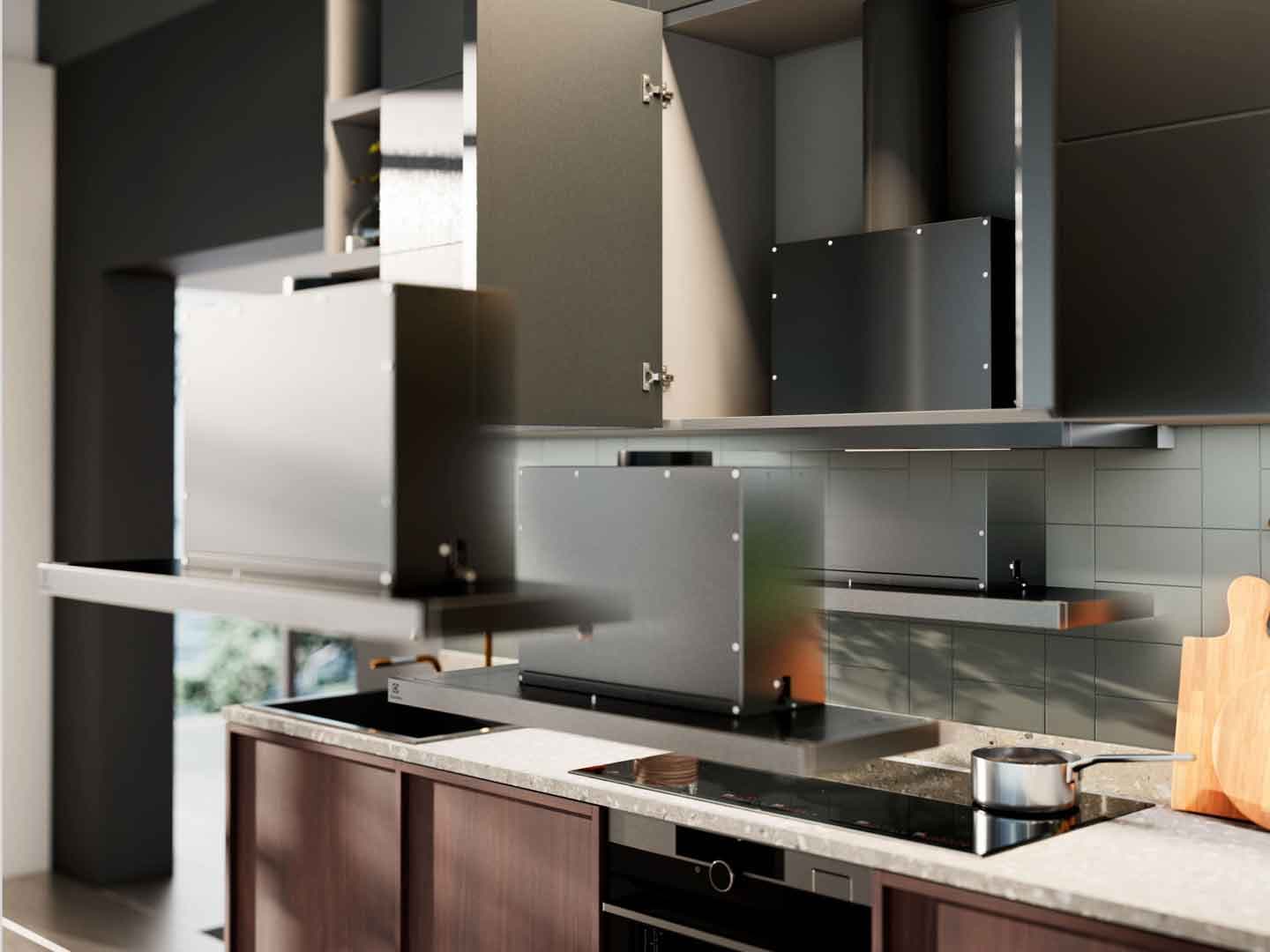 Döljs i köksbänken tills den behövs. Tryck på en knapp så skjuts köksfläkten upp ur köksbänken och aktiveras. För ner den igen när du är klar.