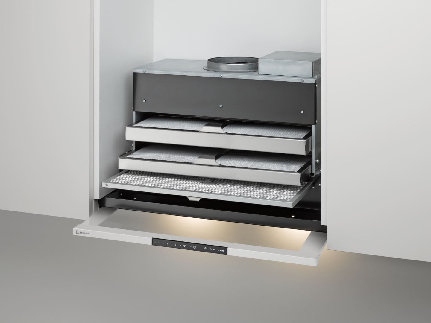 Det fina med en utdragbar köksfläkt är att den bara syns när den används. Modeller med elektronisk styrning aktiveras automatiskt när den dras ut 5 cm och skjuts tillbaka när den inte längre behövs.