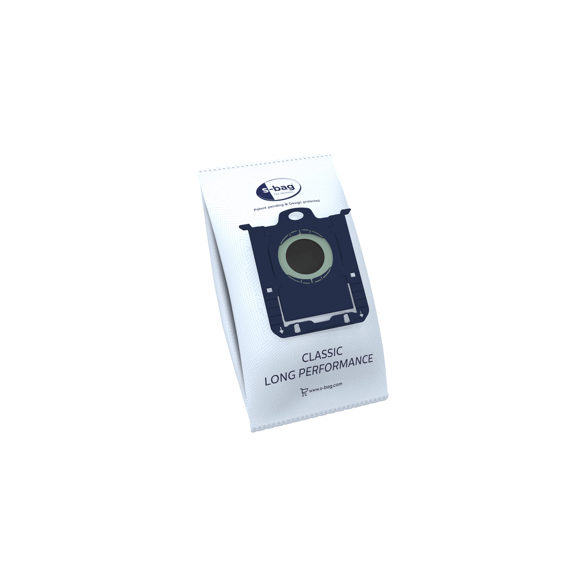 Förpackning innehållande 4 syntetiska s-bag® Classic Long Performance -dammsugarpåsar.