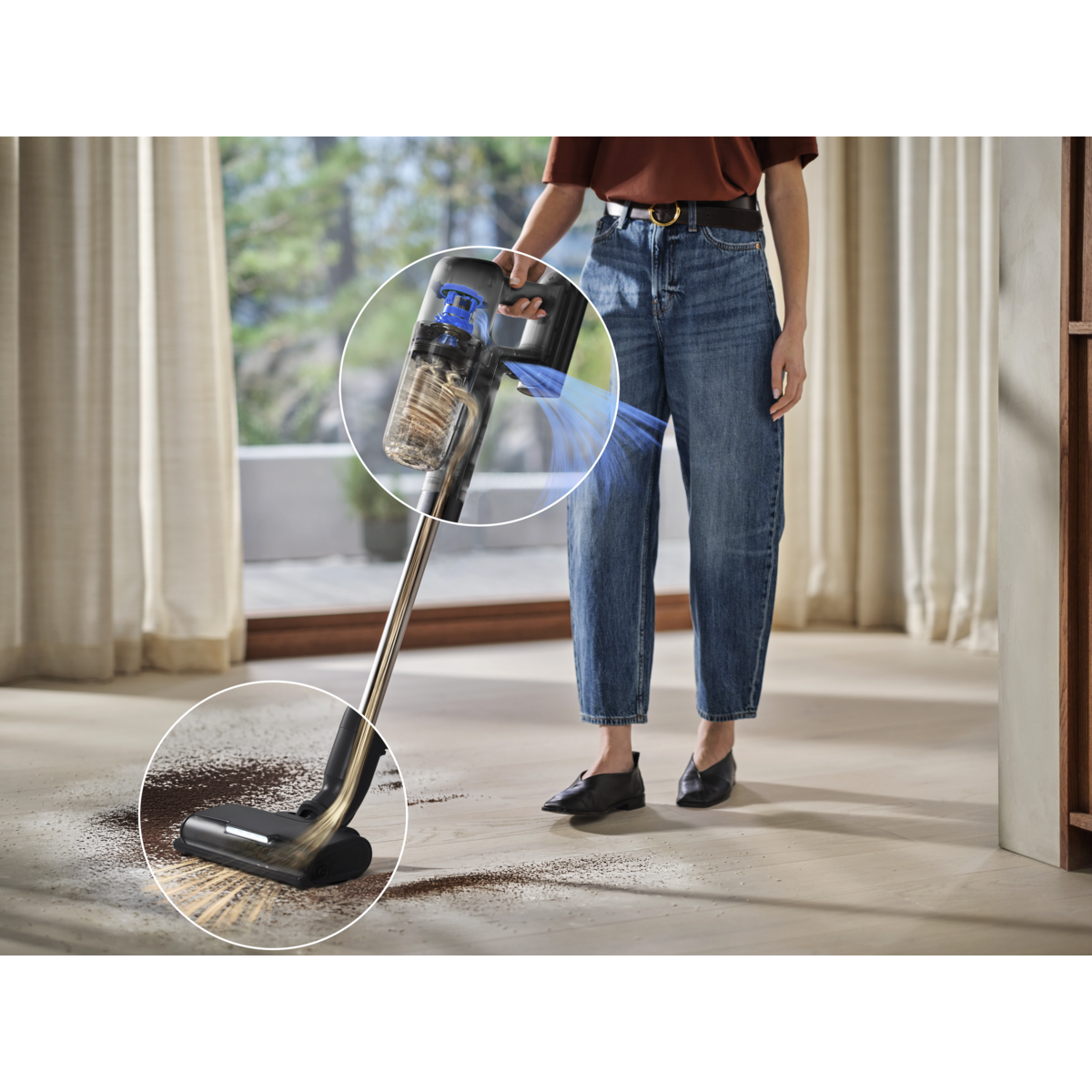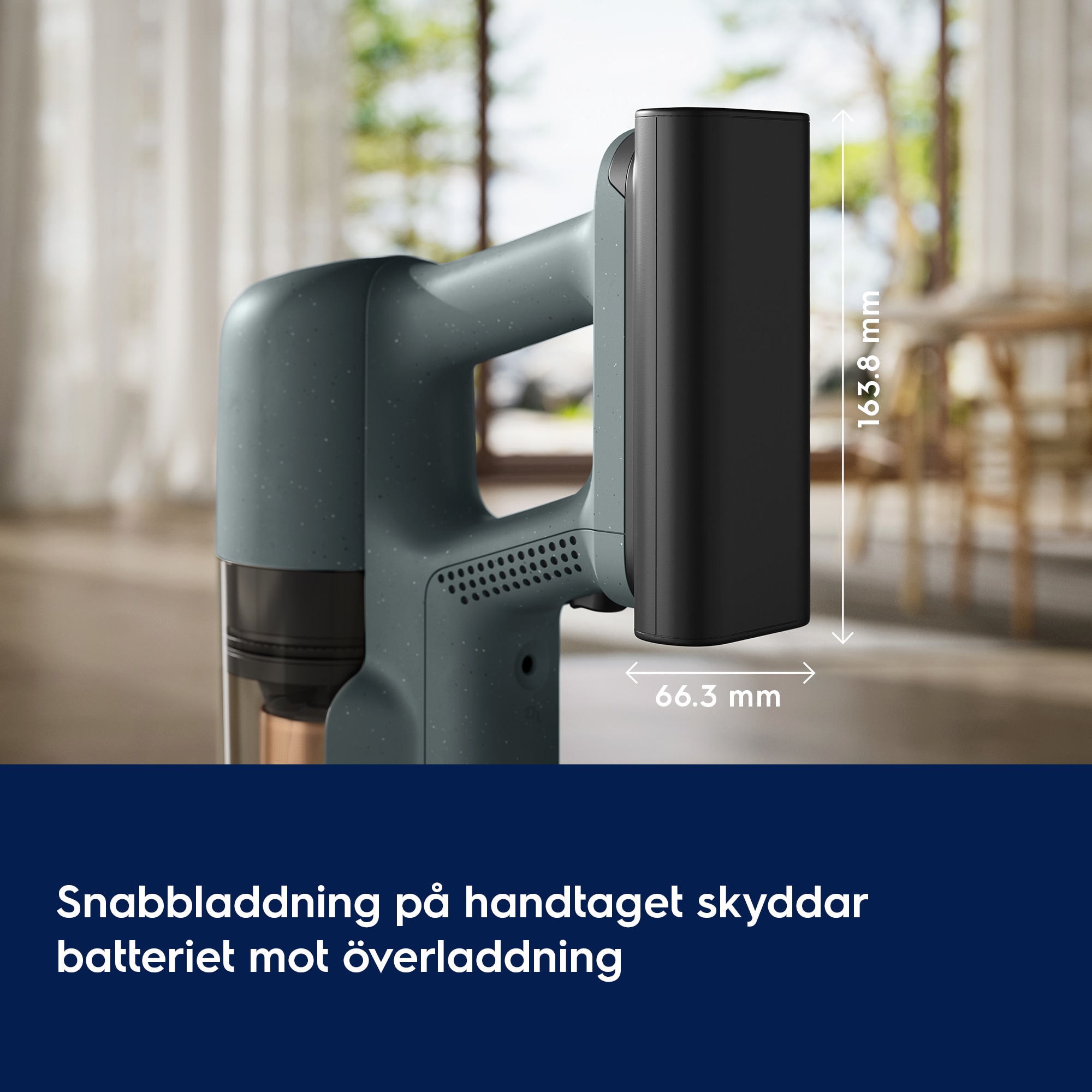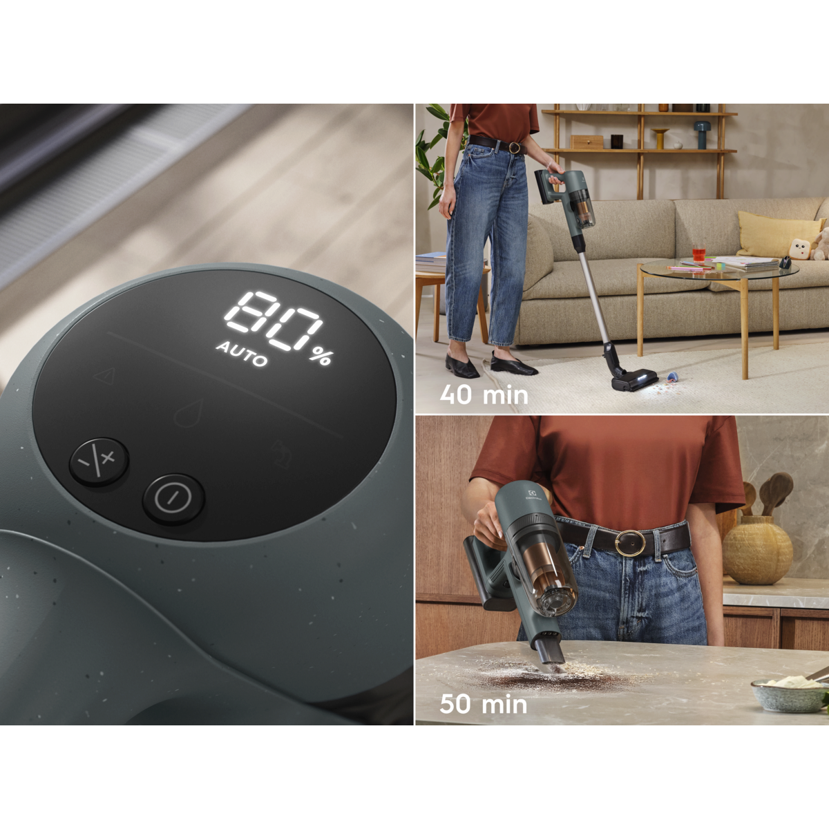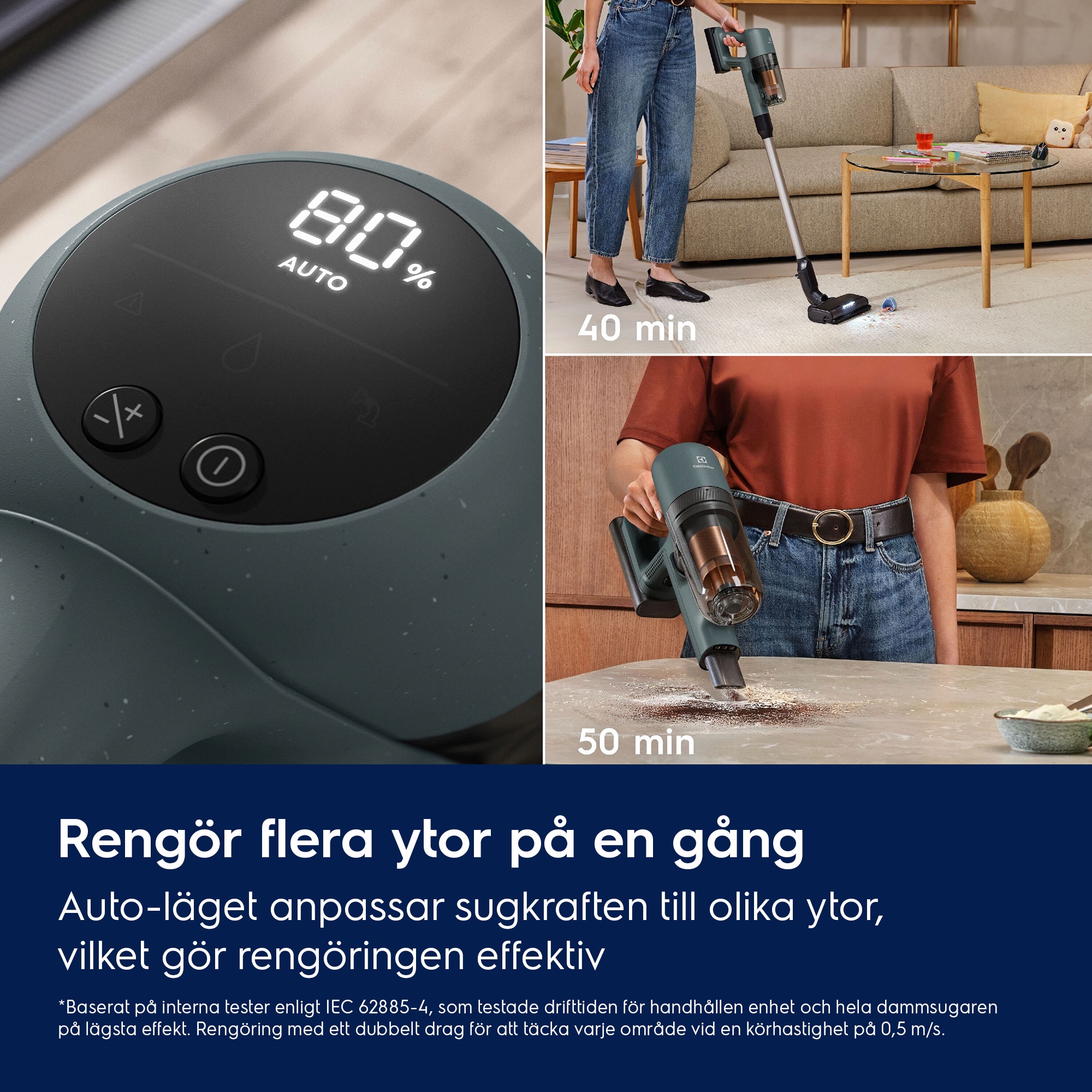 *Jämfört med drifttiden i Boost-läge. **Baserat på interna tester enligt standarden IEC 62885-4, som mäter drifttiden för handenheten och hela dammsugaren i min-läge.***Rengöringsytan för hela dammsugaren baseras på interna tester med dubbeldrag över varje yta vid en hastighet på 0,5 m/s.