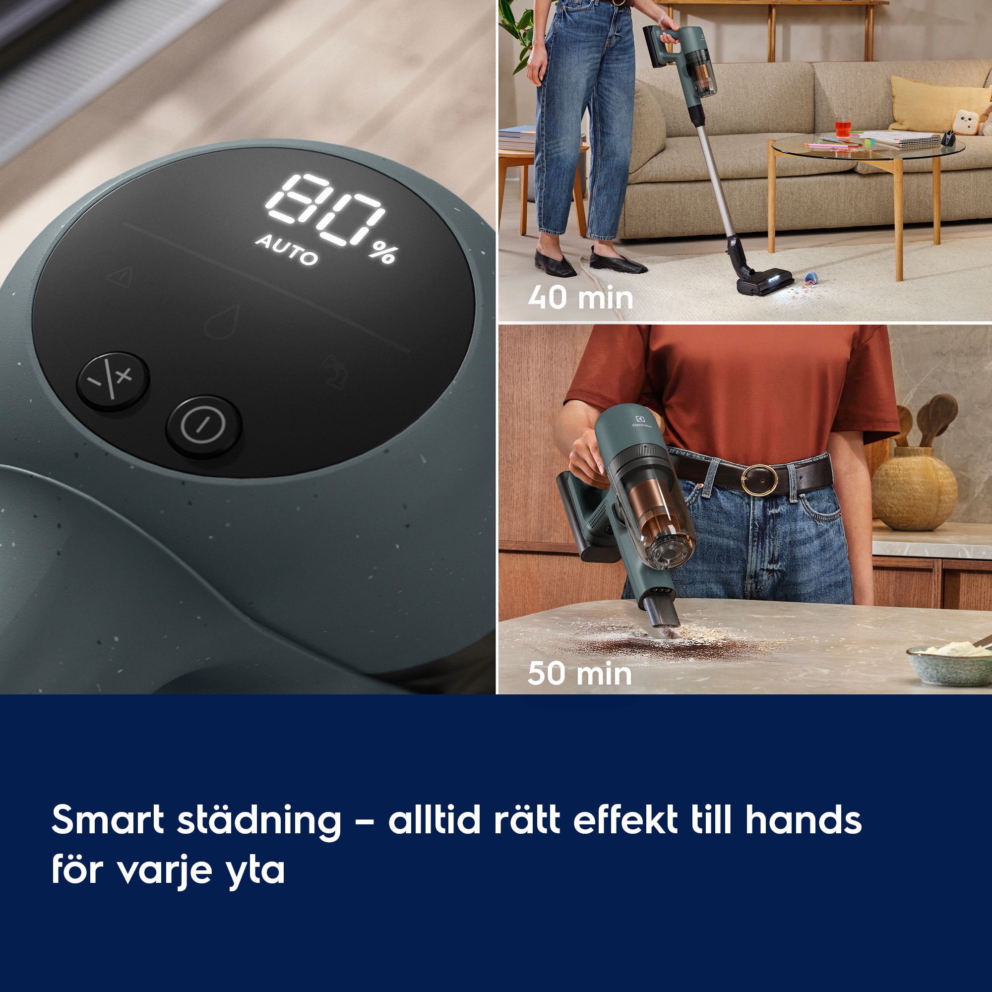 *Jämfört med tidigare Electrolux 700 skaftdammsugare. **Baserat på internt test enligt standarden IEC 62885-4.