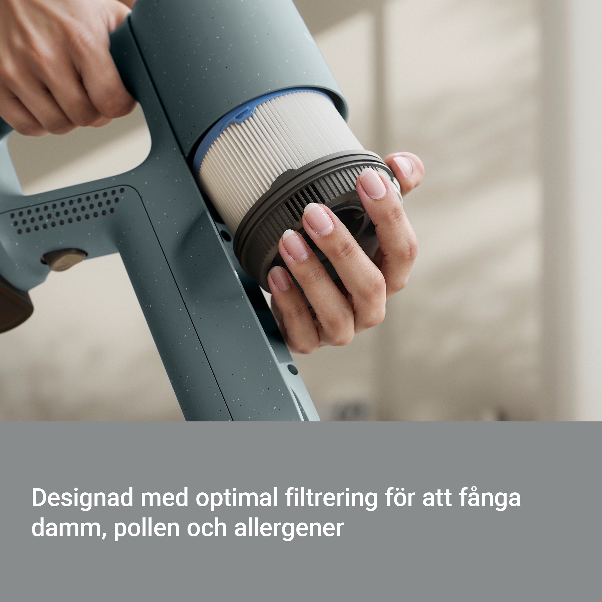 Det avancerade 6-stegs HEPA-filtreringssystemet fångar upp till 99,99 %* av partiklar mellan 0,3 och 10 mikron, inklusive damm, pollen och djurmjäll. Det nya eftermotorfiltret förbättrar filtreringen ytterligare och säkerställer att renare luft släpps ut i hemmet.