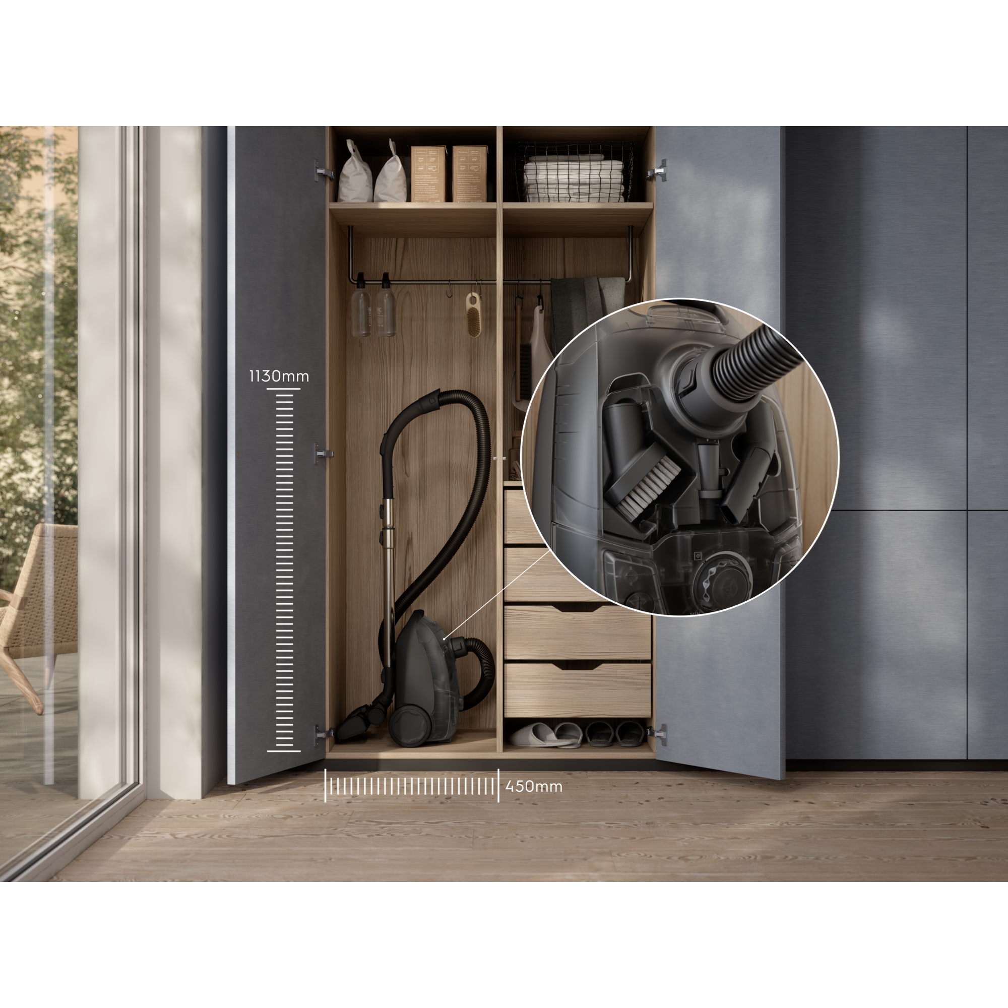 Vår mest kompakta dammsugare med påse fångar upp damm och smuts på alla ytor med varje drag. AllFloor-munstycket gör det enkelt att gå mellan golv och mattor samtidigt som de inbyggda tillbehören alltid finns nära till hands