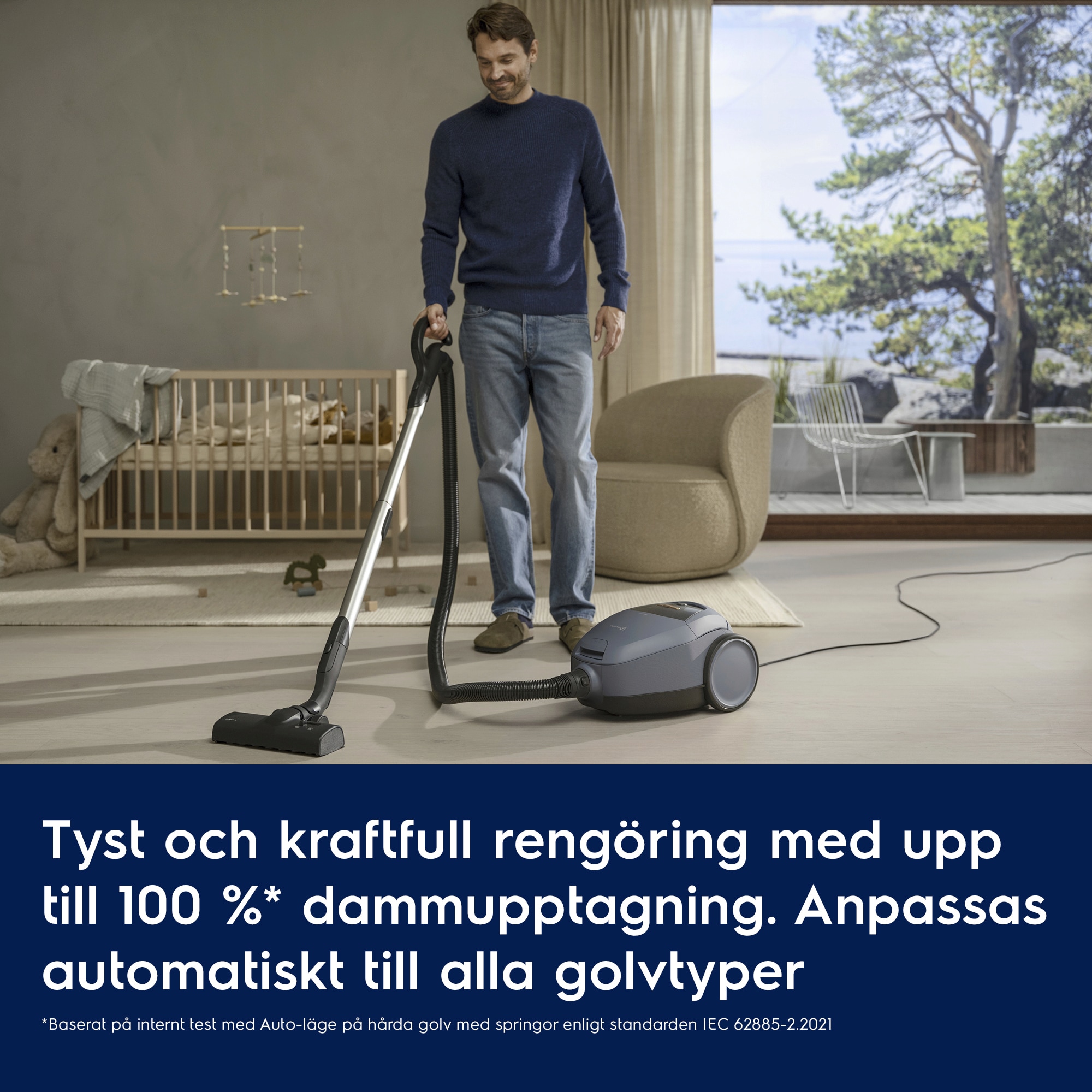 *Baserat på internt test i Auto-läge på hårda golv med springor enligt standarden IEC 62885-2:2021.