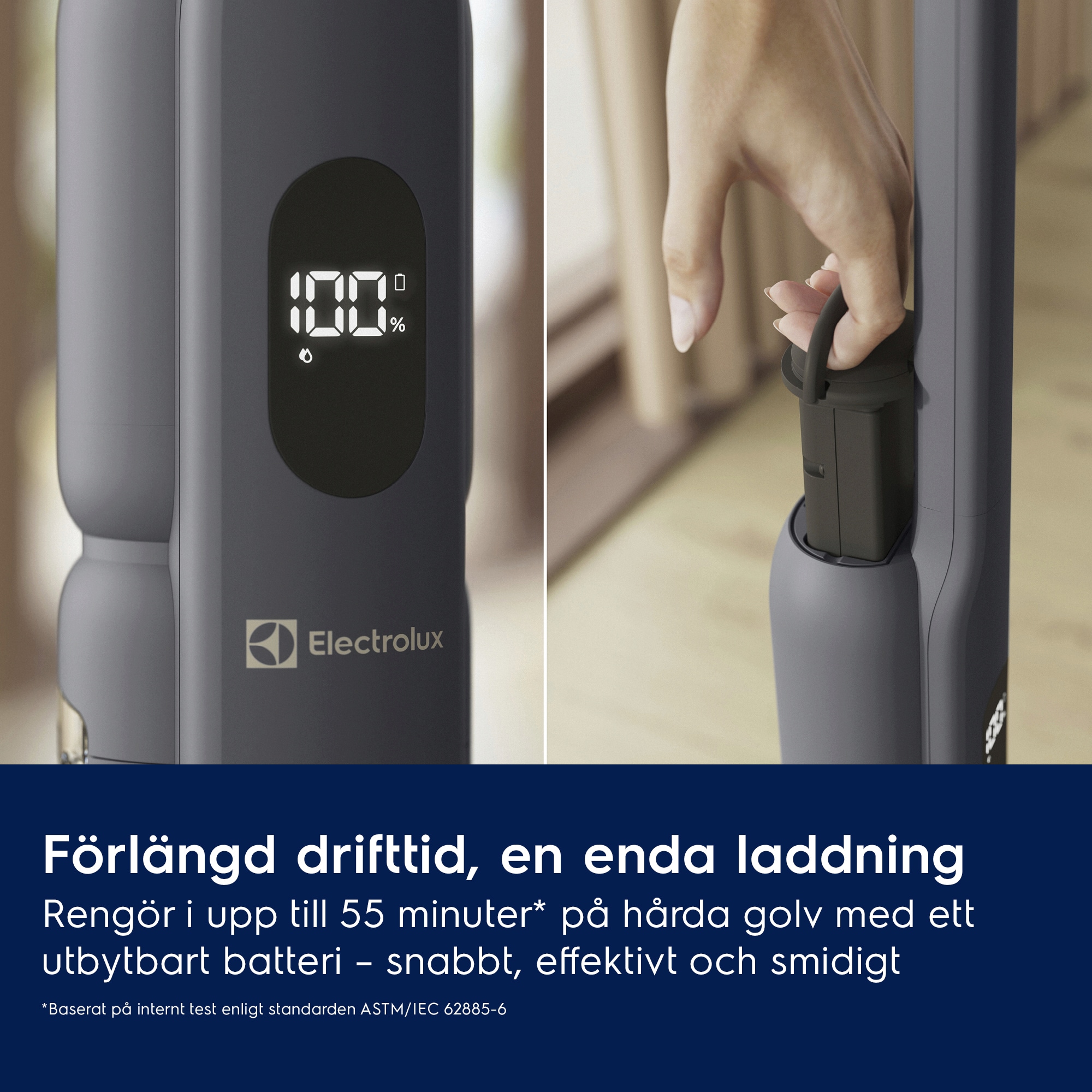 Upp till 55 minuters* rengöring på hårda golv, och med ett utbytbart batteri