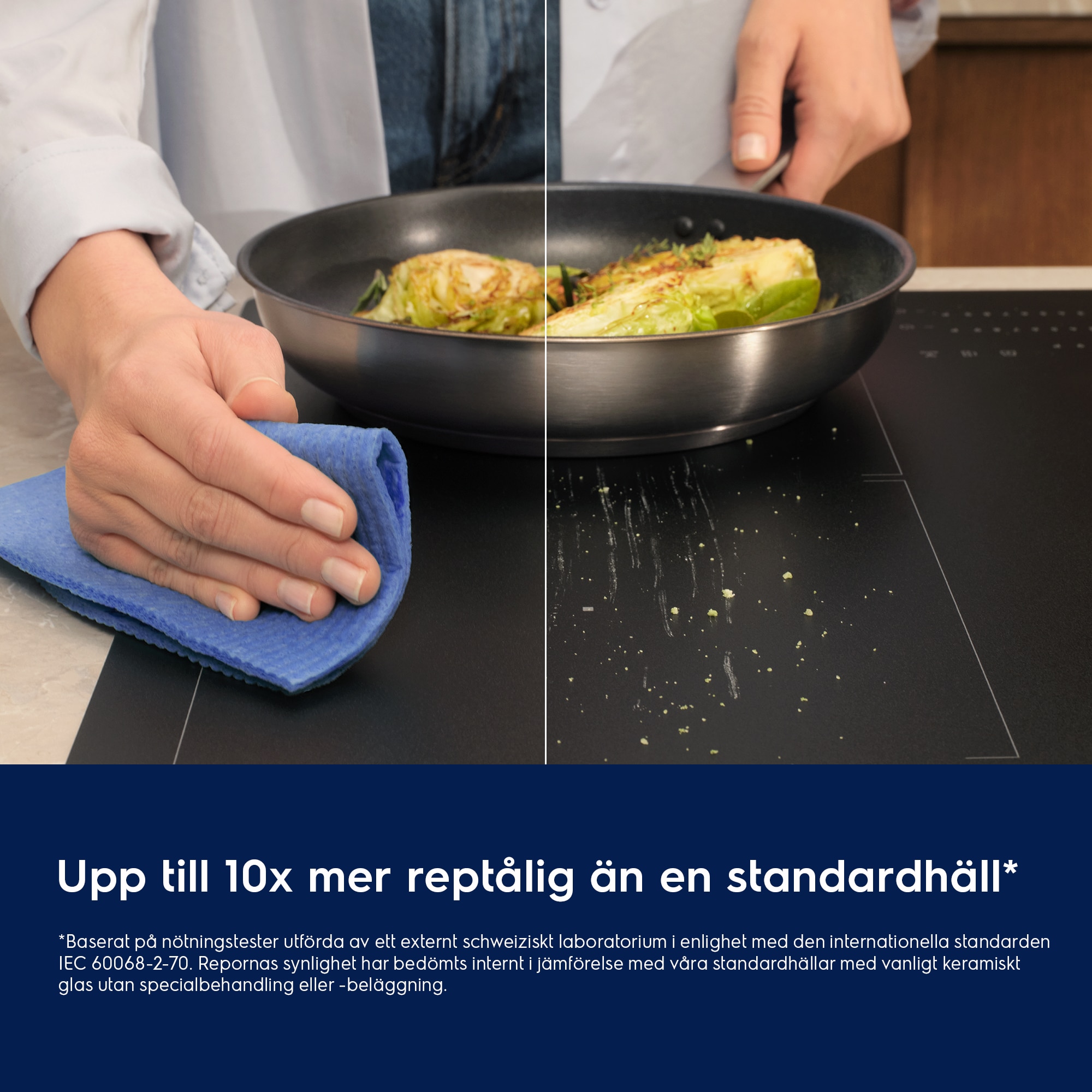 *Baserat på ett nötningstest utfört av ett externt schweiziskt laboratorium i enlighet med internationell standard IEC 60068-2-70. Synlighet av repor bedöms internt i jämförelse med våra standardhällar av keramiskt glas utan särskild behandling eller beläggning.