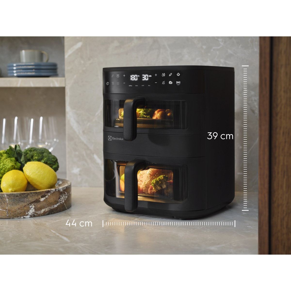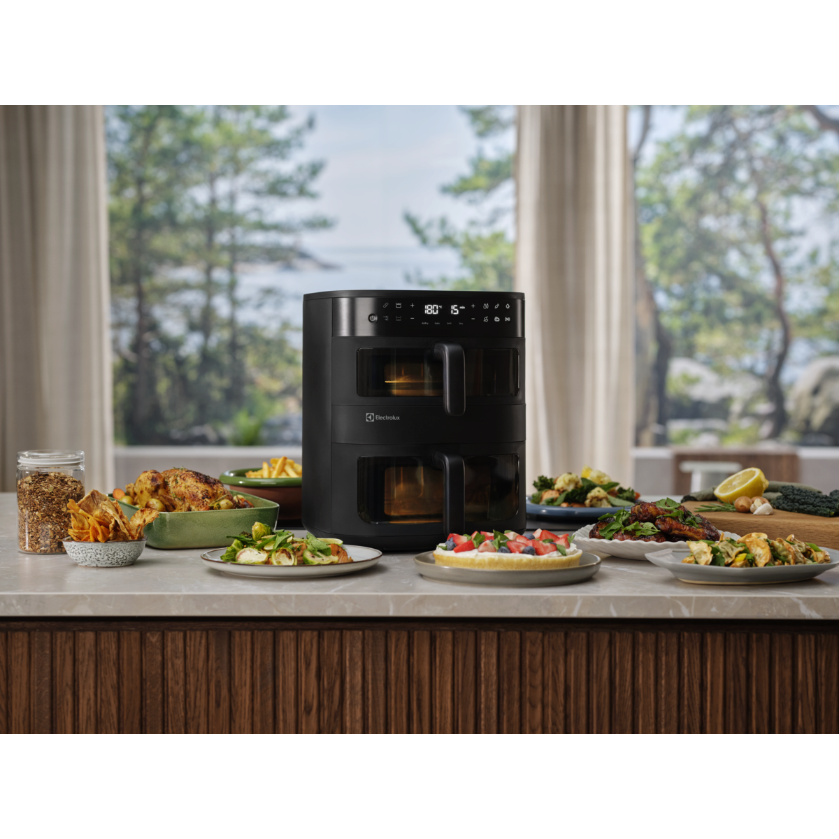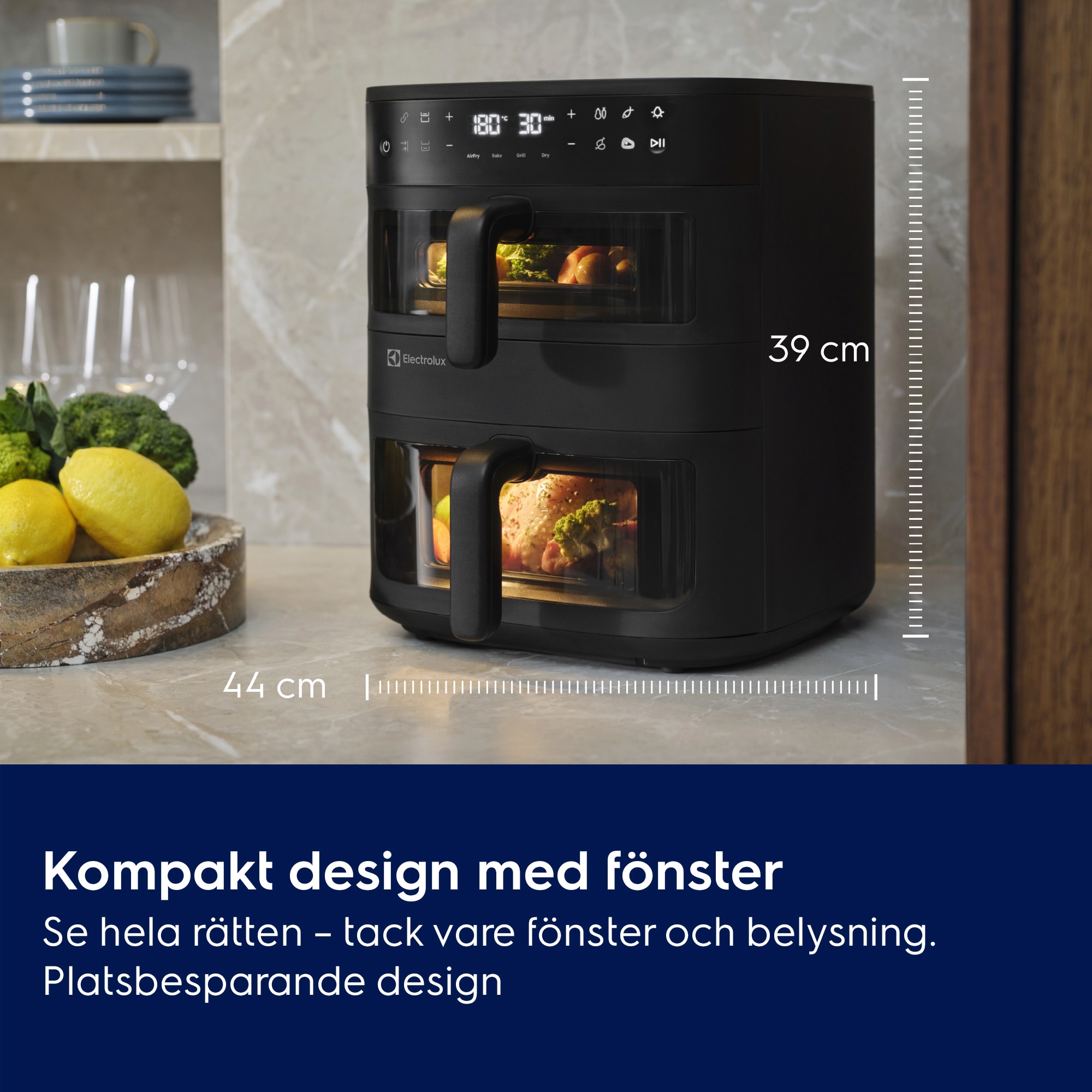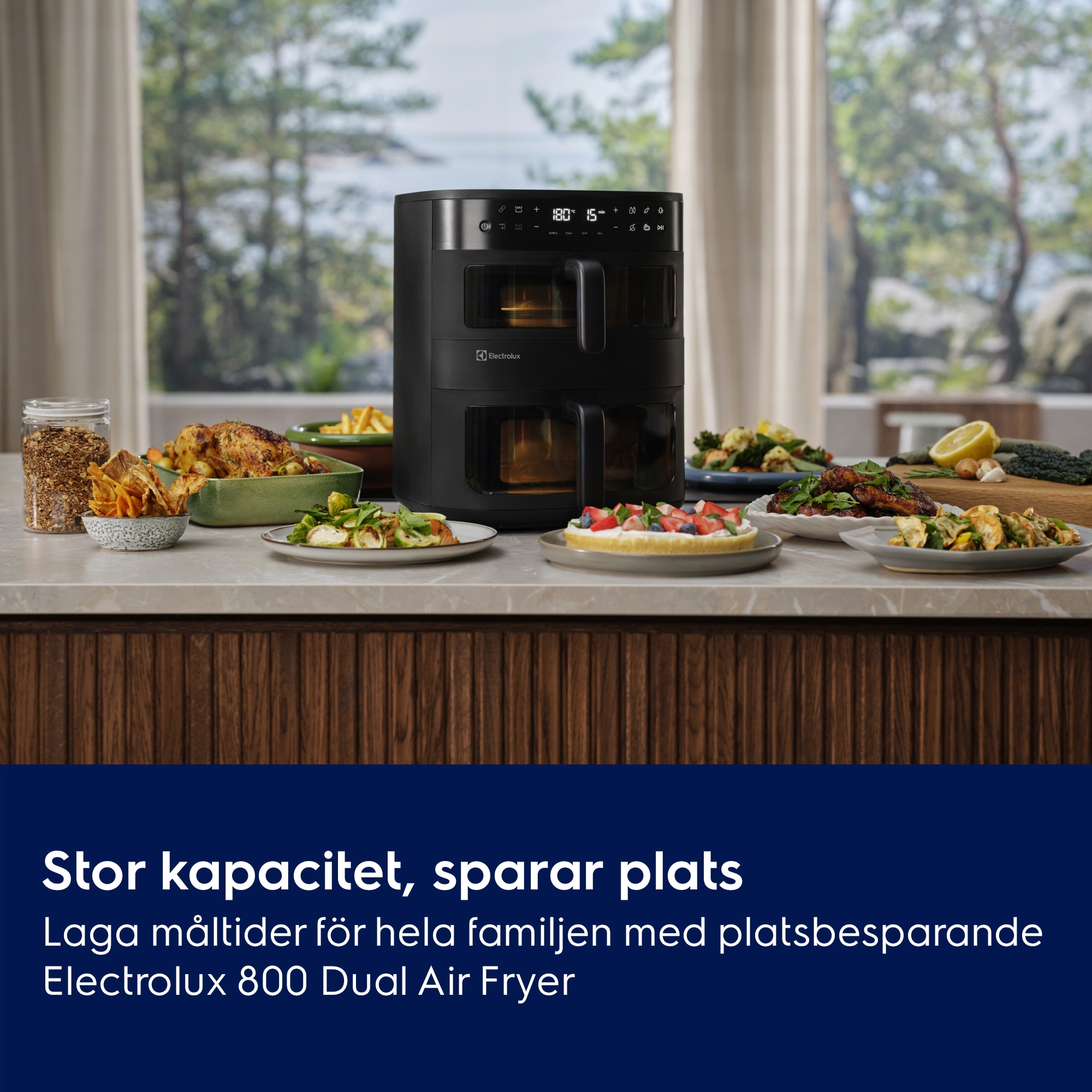 Måltider för hela familjen med Electrolux 800 Dual AirFryer. Dubbla vertikala korgar i kombination med fönster och invändig belysning gör det enkelt att hålla koll på två rätter samtidigt – eller en större portion. Jämn värmefördelning ger utmärkta resultat i en elegant och platsbesparande design.