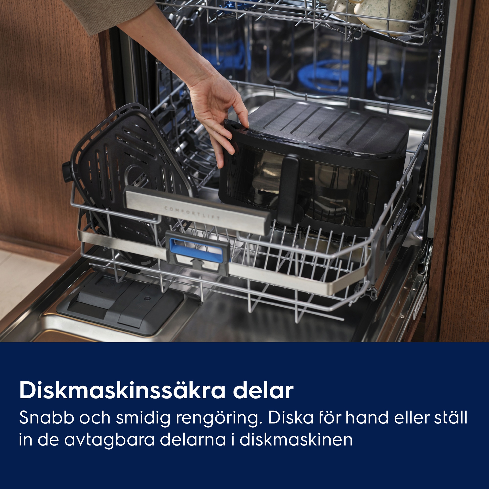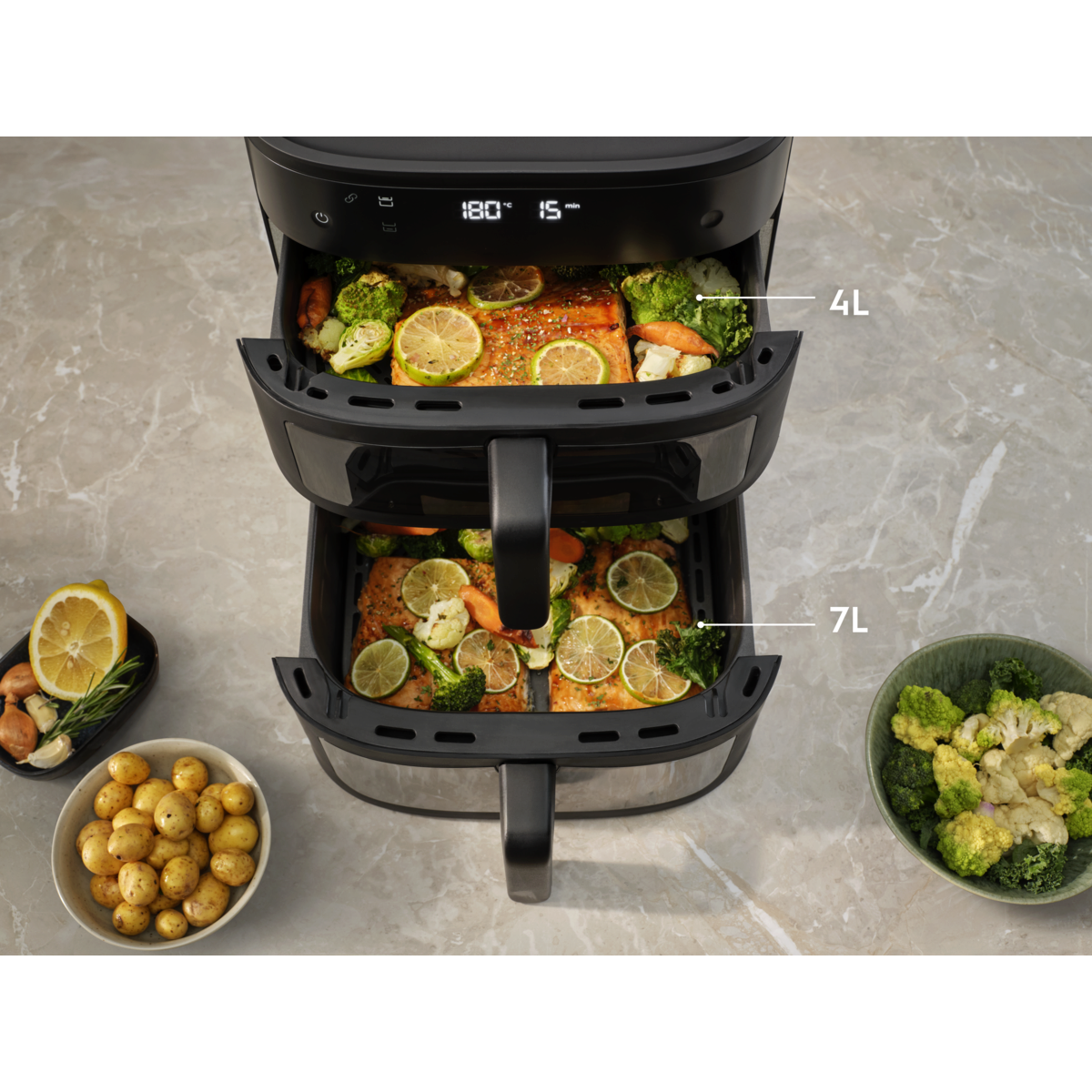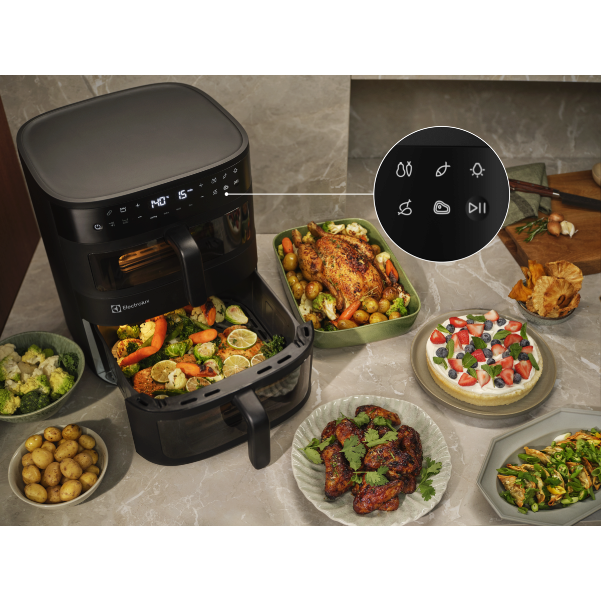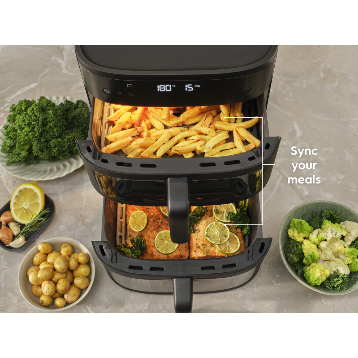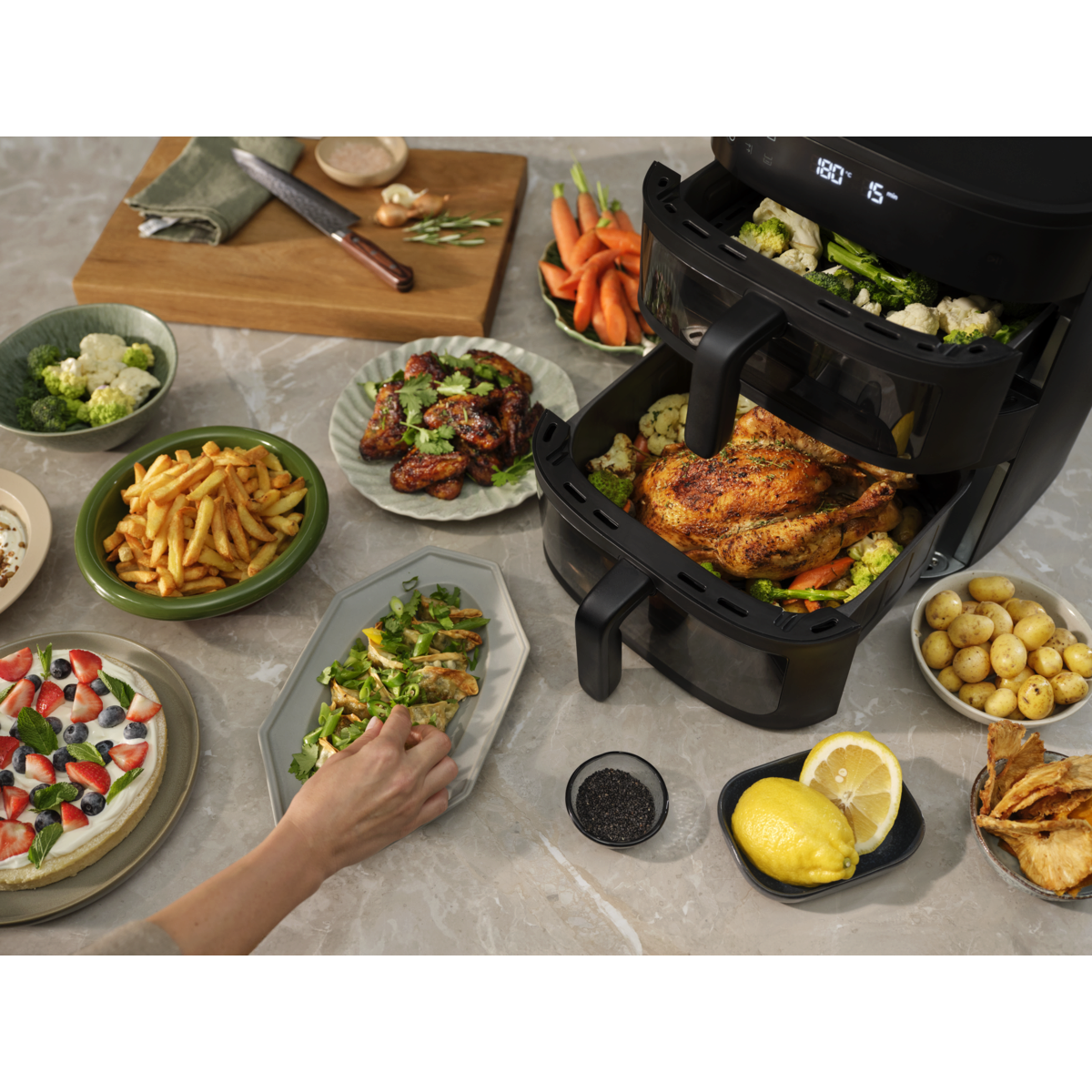 Måltider för hela familjen med Electrolux 800 Dual AirFryer. Dubbla vertikala korgar i kombination med fönster och invändig belysning gör det enkelt att hålla koll på två rätter samtidigt – eller en större portion. Jämn värmefördelning ger utmärkta resultat i en elegant och platsbesparande design.