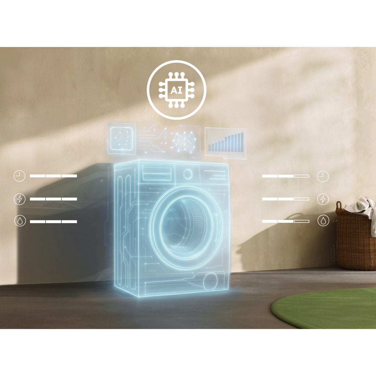 *Baserat på en algoritm för tvättmängdsavkänning som är förtränad på olika typer av tvätt. Ingen användardata används för att vidareutbilda AI:n. **Baserat på interna tester av tids-, vatten- och energiförbrukning för en tvätt på 1 kg jämfört med maxkapacitet i bomullsprogrammet 30 °C med AI WashAssist, som anpassar programmet efter tvättmängden.