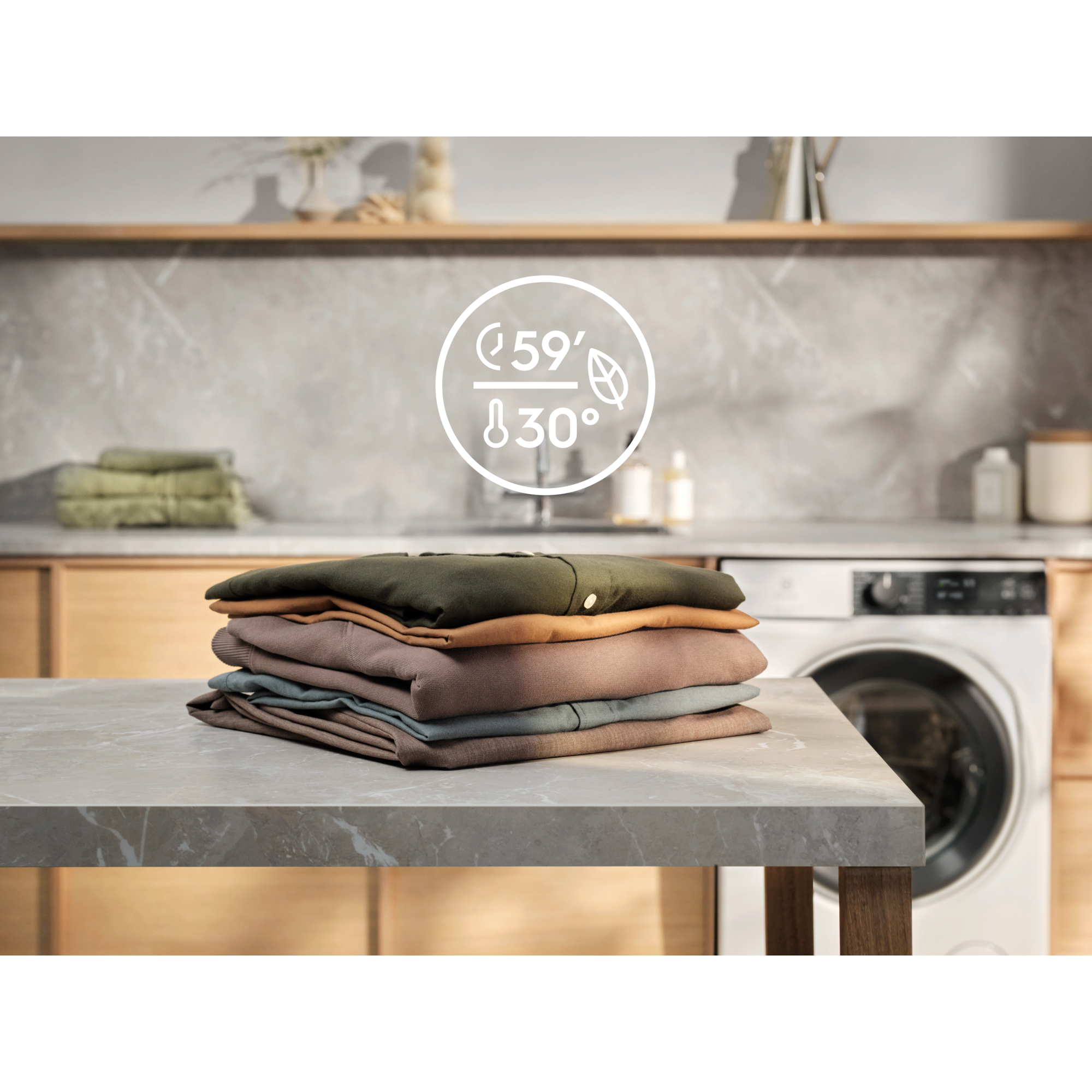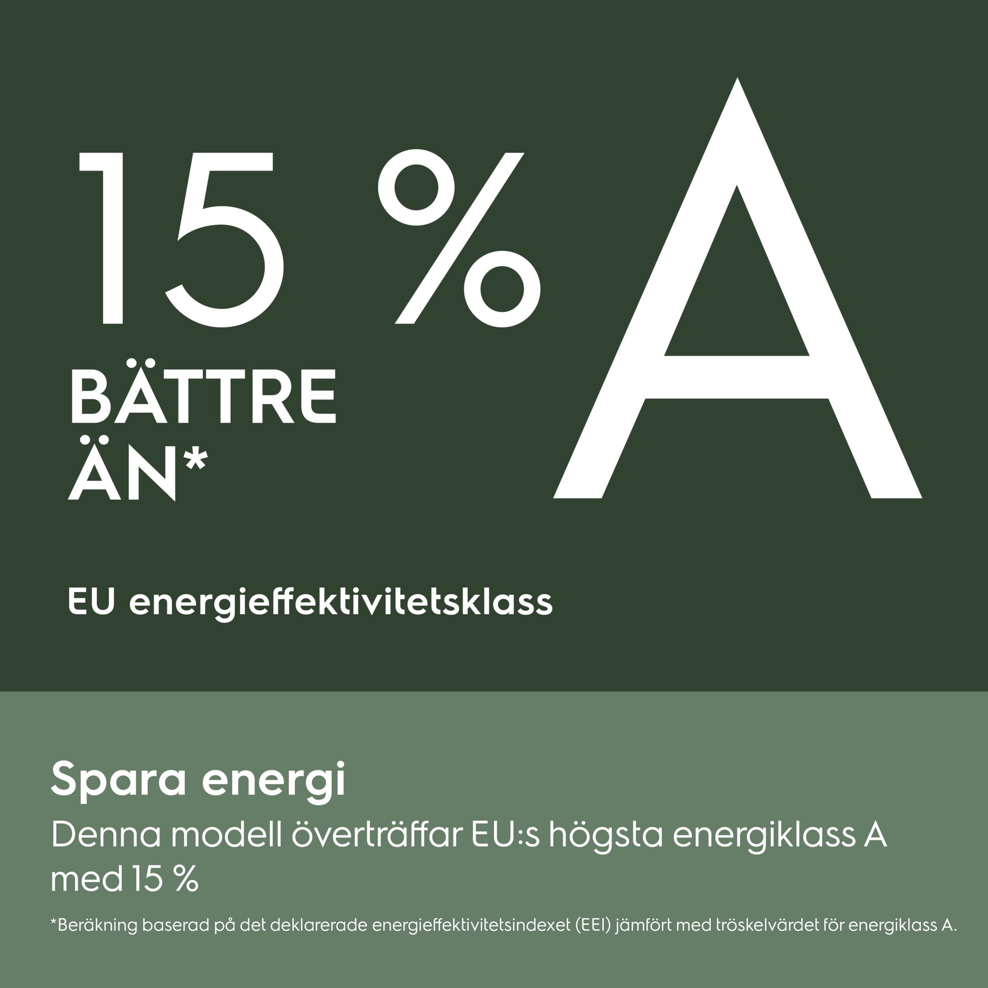 *Baserat på interna tester av tid-, vatten- och energiförbrukning för en tvätt på 1 kg jämfört med en full maskin i bomullsprogram 30 °C med hjälp av SensiCare+ som justerar programmet baserat på tvättmängden.