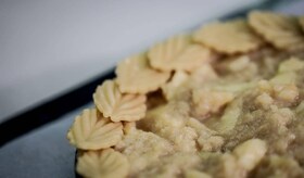 - Lägg på dekorativa utskurna blad eller äpplen som du gör av degen som blir över