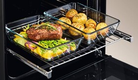 De medföljande bakplåtsskenorna kan placeras på vilken höjd som helst i ugnen och gör galler eller bakplåtar utdragbara. Med denna smidiga och flexibla lösning slipper du sträcka in handen i den heta ugnen.