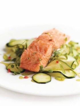 Skär försiktigt upp laxen och servera på förvärmda tallrikar.